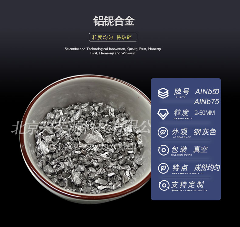 铝铌中间合金作为一种高性能材料,因其独特的物理和化学属性,被广泛应用于高温合金领域。尤其是AlNb75,作为铝铌合金中的重要产品之一,因其具有易破碎的特性和youxiu的热稳定性,成为众多工业生产中的shouxuan。本文将围绕铝铌中间合金产品,从材料特性、应用价值、生产工艺等多个层面进行详细剖析,旨在帮助您更好地理解这款产品的优势与潜力,介绍北京兴荣源科技有限公司在该领域的优势和服务。