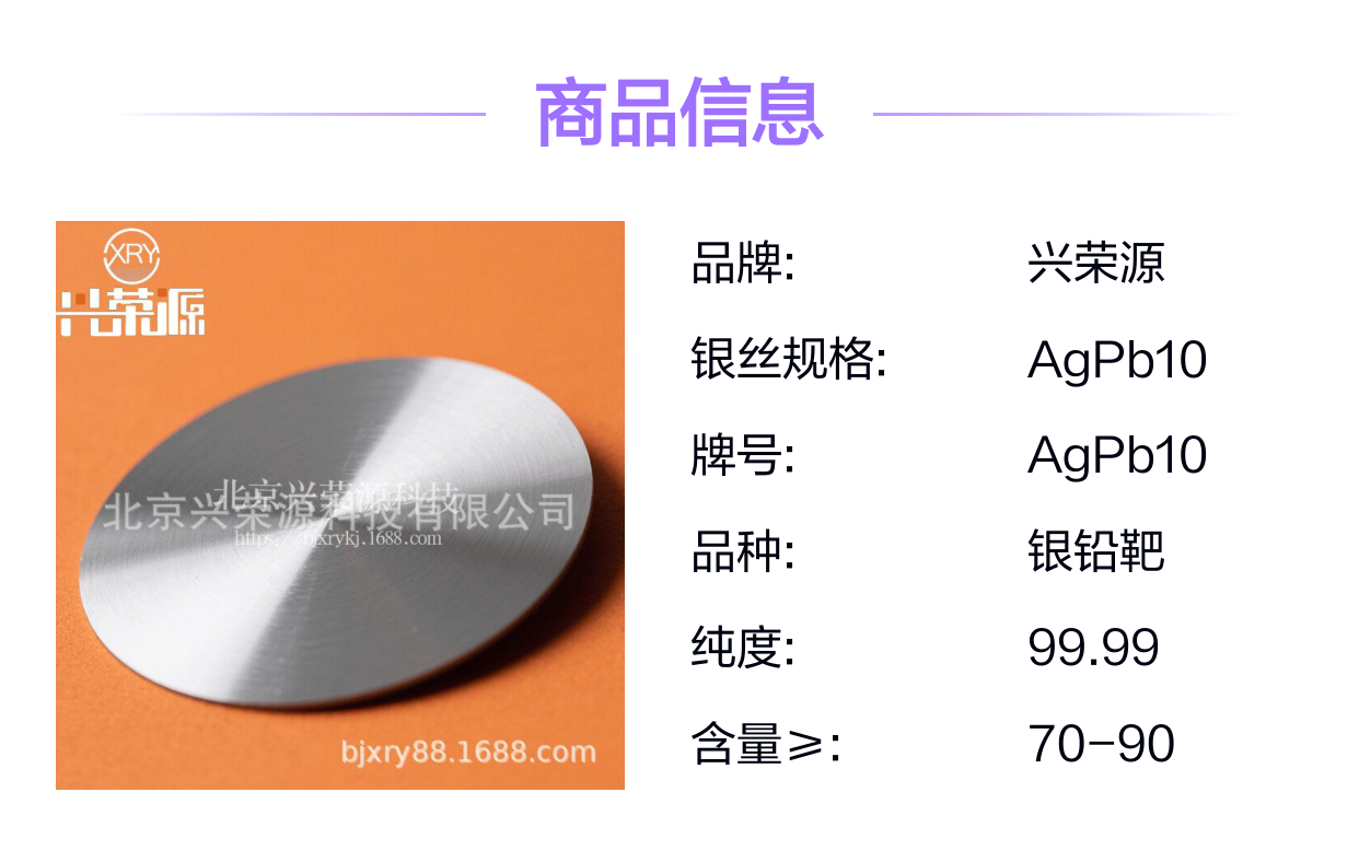 银铅合金靶,尤其是灰白AgPb10型号,因其独特的材料特性,在电子封装、光伏行业及核工业领域展现出广泛的应用前景。作为北京兴荣源科技有限公司主推的产品之一,银铅合金靶凭借其优异的性能和稳定的供应链,成为相关产业链中不可或缺的关键材料。