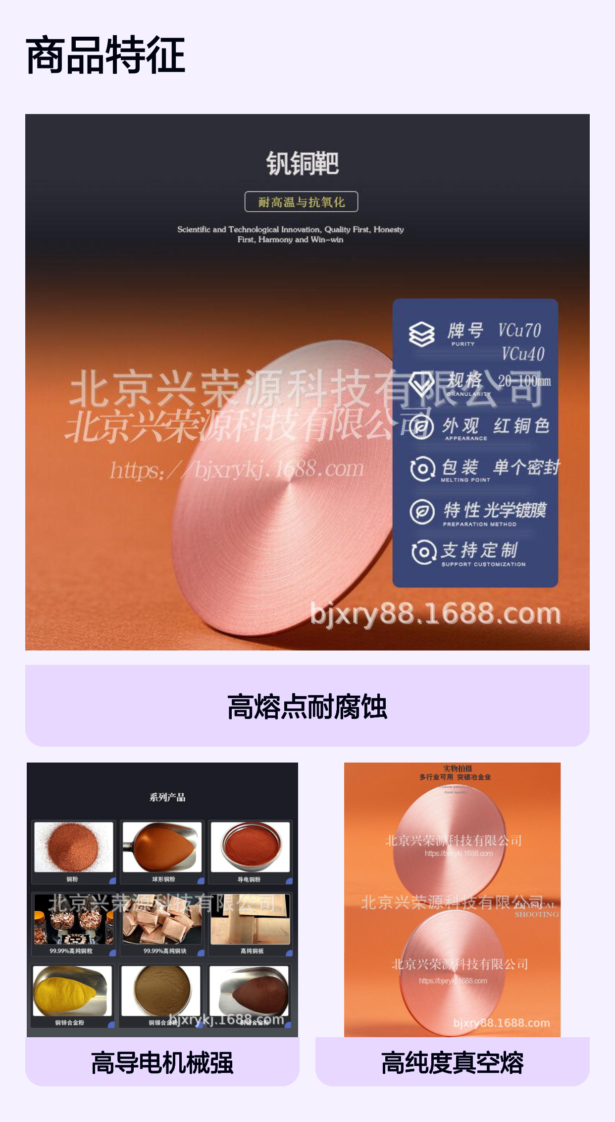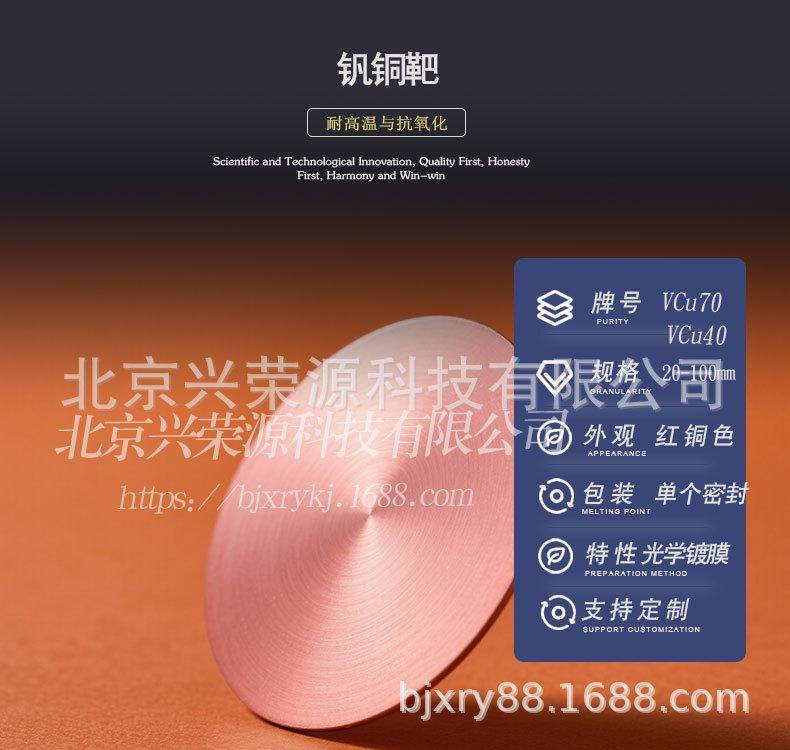 钒铜合金靶作为一种重要的功能材料,工业领域扮演着buketidai的角色。北京兴荣源科技有限公司推出的钒铜合金靶系列产品——VCu30和VCu50,适用于装饰镀膜和半导体器件制造,凭借其优良的性能和稳定的质量,成为众多客户的优选材料。