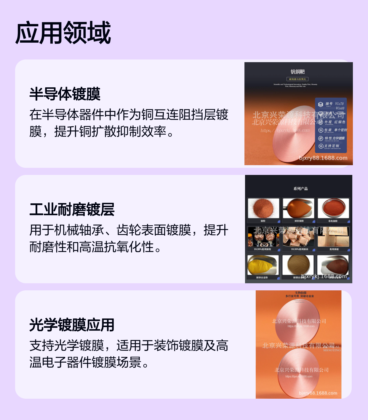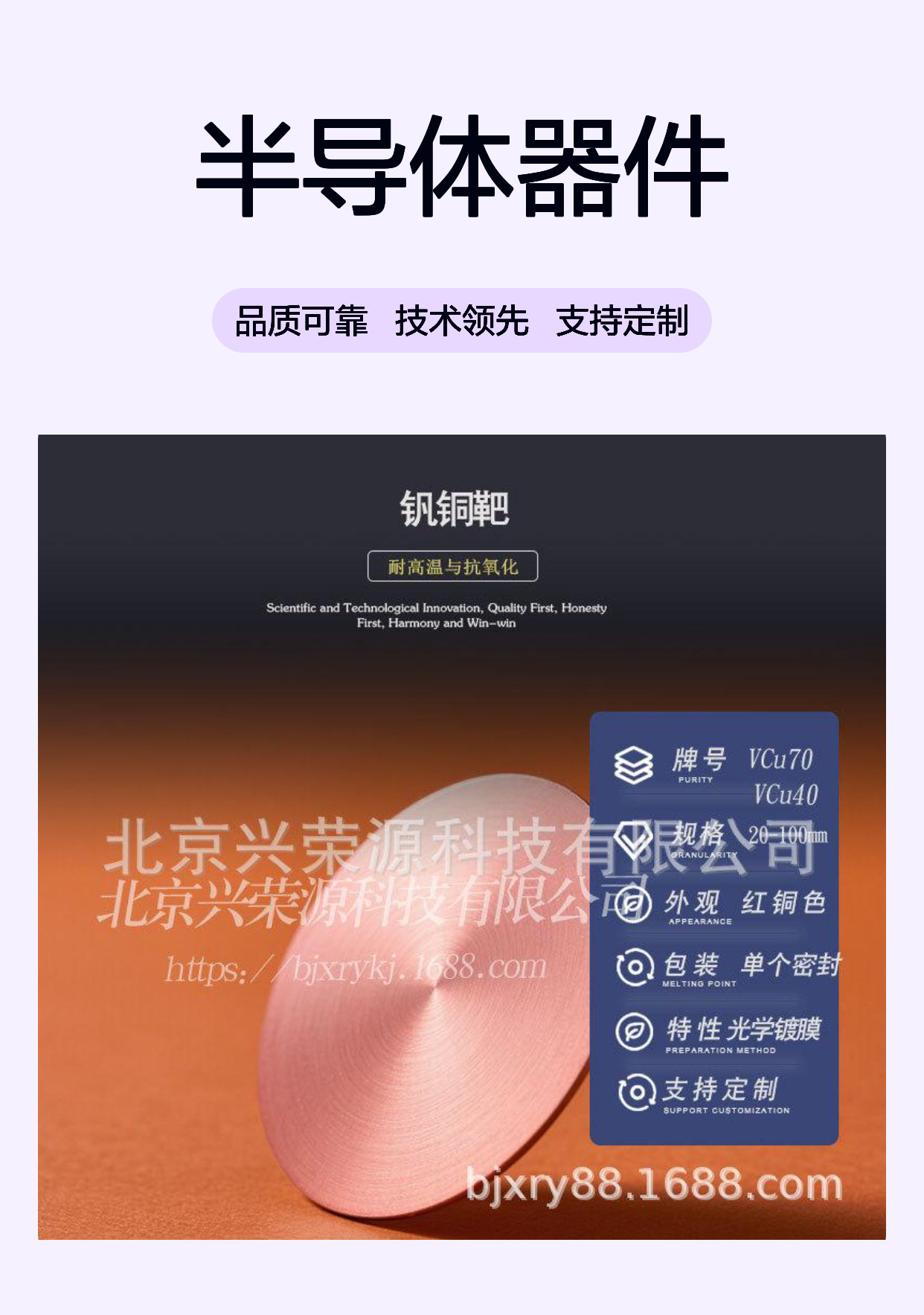 钒铜合金靶作为连接传统铜和钒元素优势的关键材料,凭借其多功能性和稳定性,在装饰镀膜和半导体器件制造中发挥着重要作用。北京兴荣源科技有限公司的VCu30和VCu50钒铜靶,以其优异的性能和可靠的品质,成为业内信赖的供应选择。合理应用钒铜合金靶,不仅能提升产品质量,也能有效控制生产成本,是提升产业竞争力的重要利器。