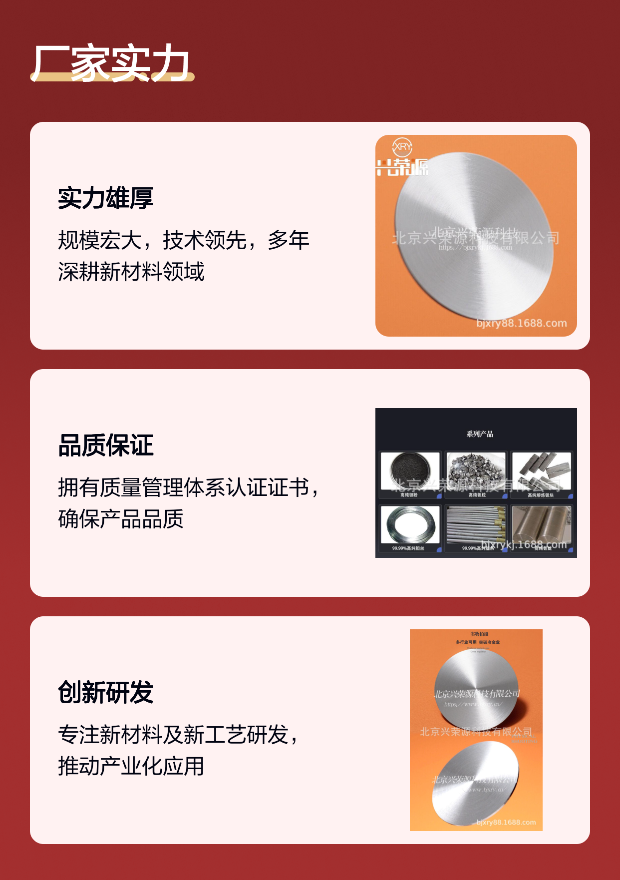 作为专业从事镁铝合金靶生产的企业,北京兴荣源科技有限公司融合了丰富的行业经验和先进技术,致力于为客户提供稳定、高效的材料解决方案。公司不仅注重产品质量,更关注售后服务和技术支持,确保客户在使用过程中获得持续优化的价值。卓越的交货能力和合理的价格体系也使得北京兴荣源成为众多光学与半导体企业优先合作的对象。